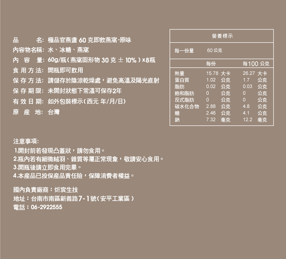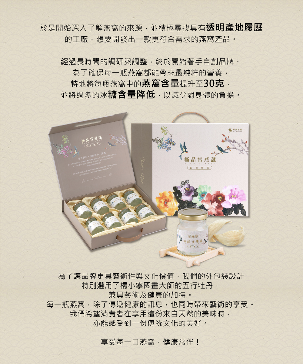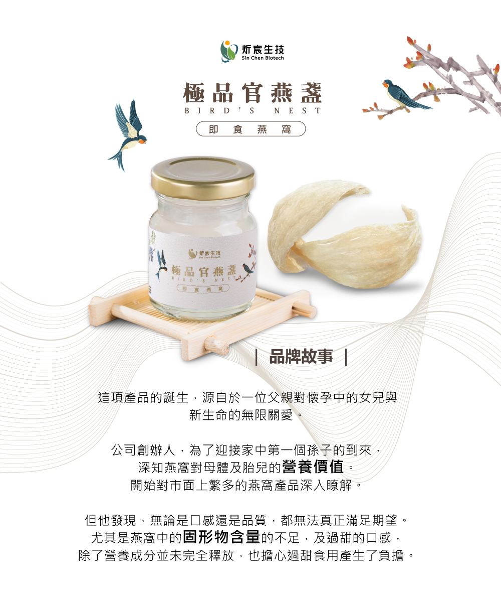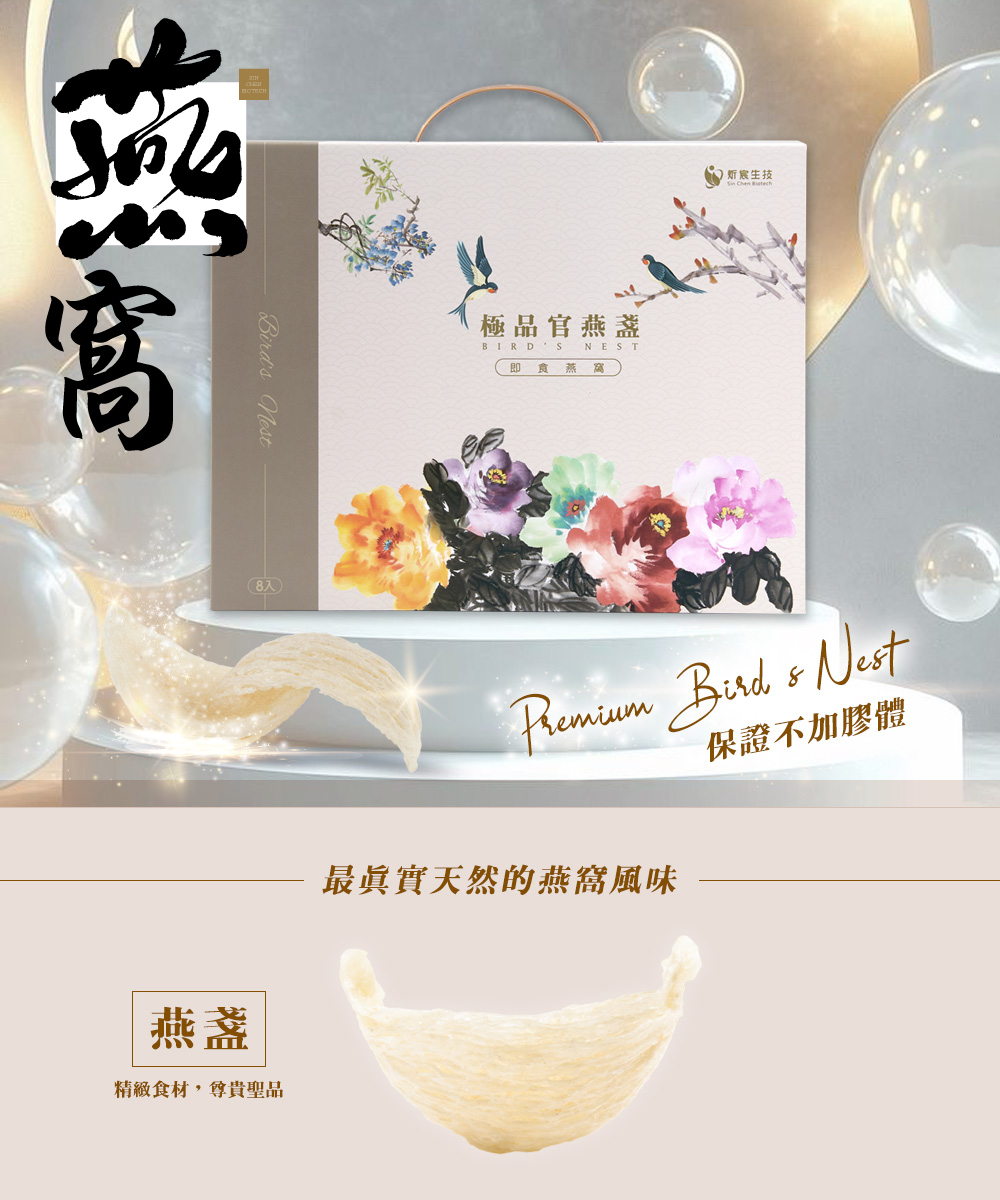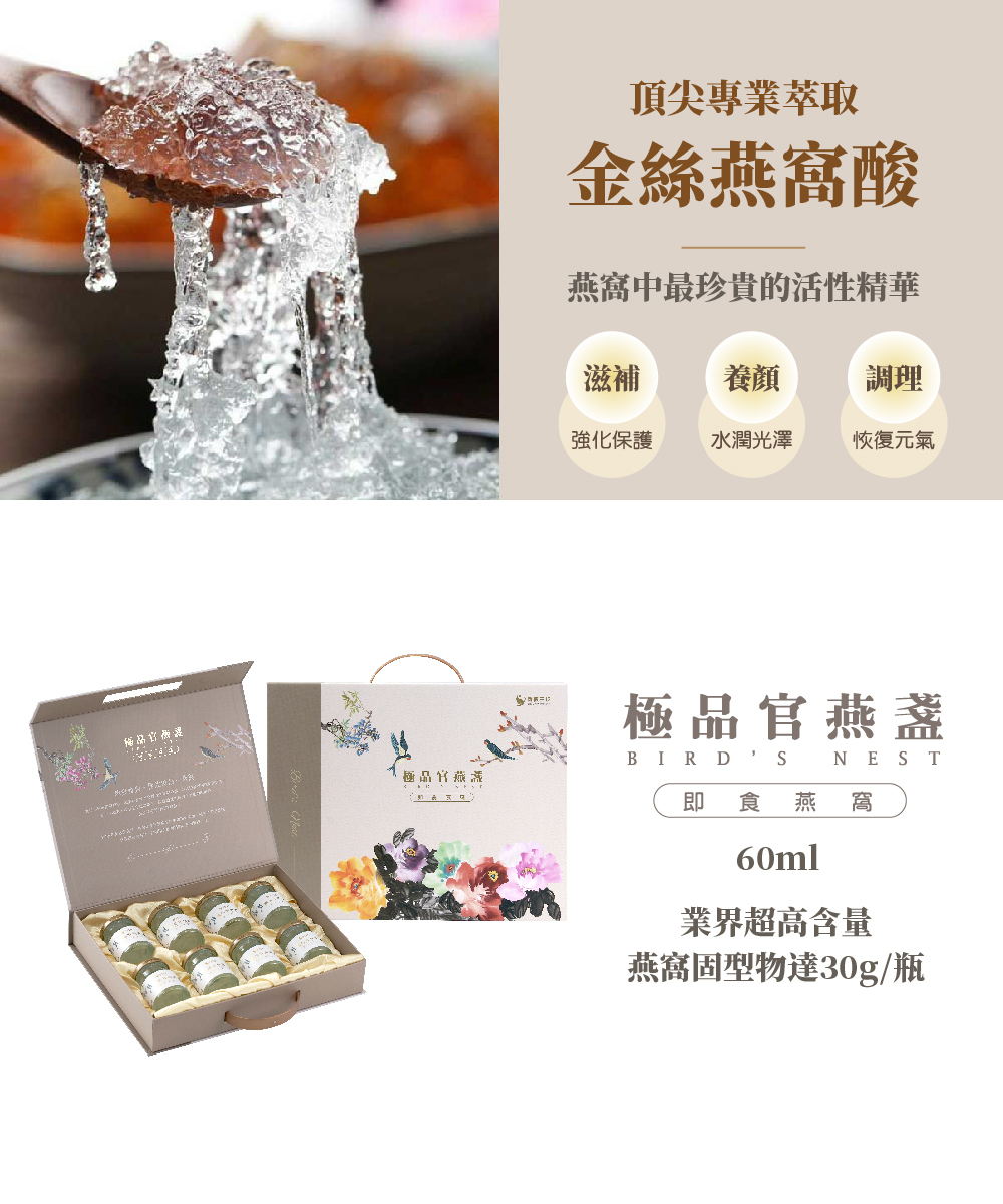 頂級燕窩,給您最輕鬆的養生方式,適合日常營養補給、養顏美容食用,保養持續不間斷,效果更佳。
