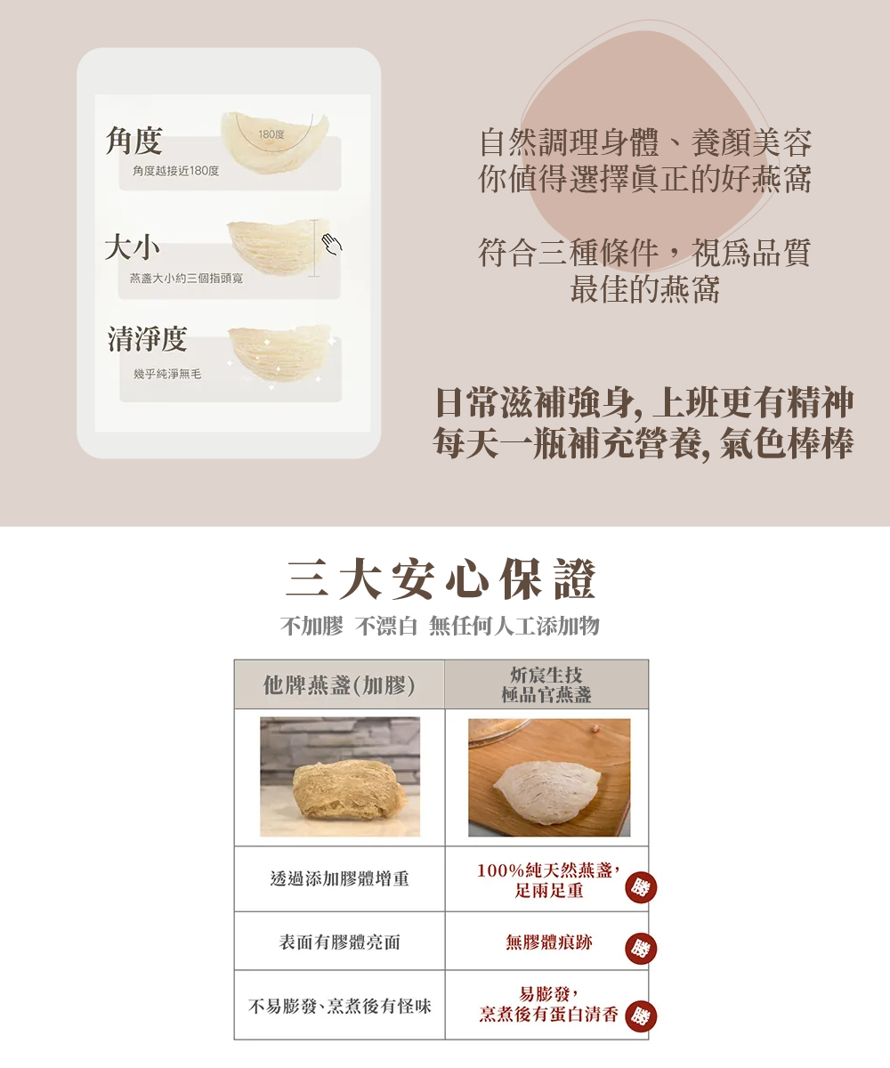 頂級燕窩,給您最輕鬆的養生方式,適合日常營養補給、養顏美容食用,保養持續不間斷,效果更佳。