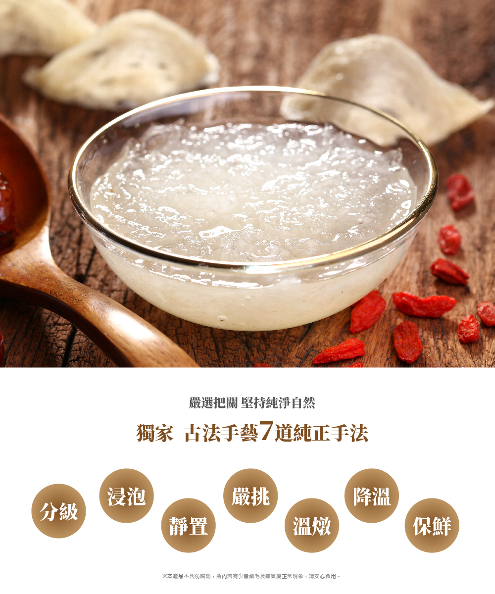※ 本產品不含防腐劑,瓶內若有少量細毛屬真燕窩證明,請安心食用