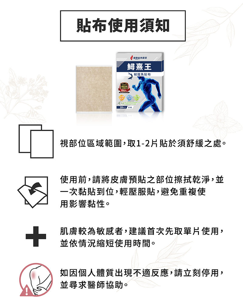 當酸痛時,可以取1-2片視患部大小貼於串處5-6小時。